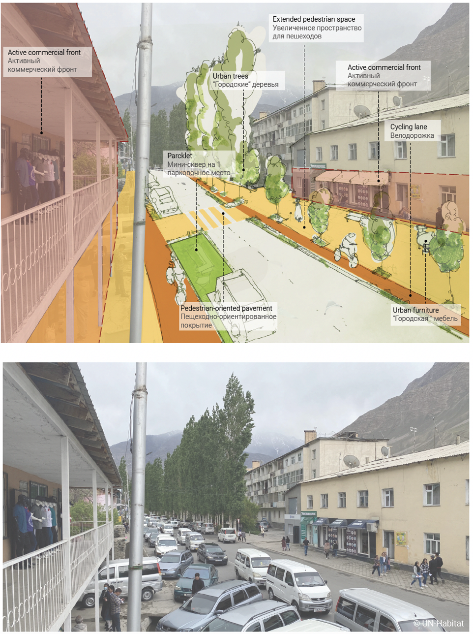 Fig. 8 Ideas for street redesign for the selected route in the central area of Khorog