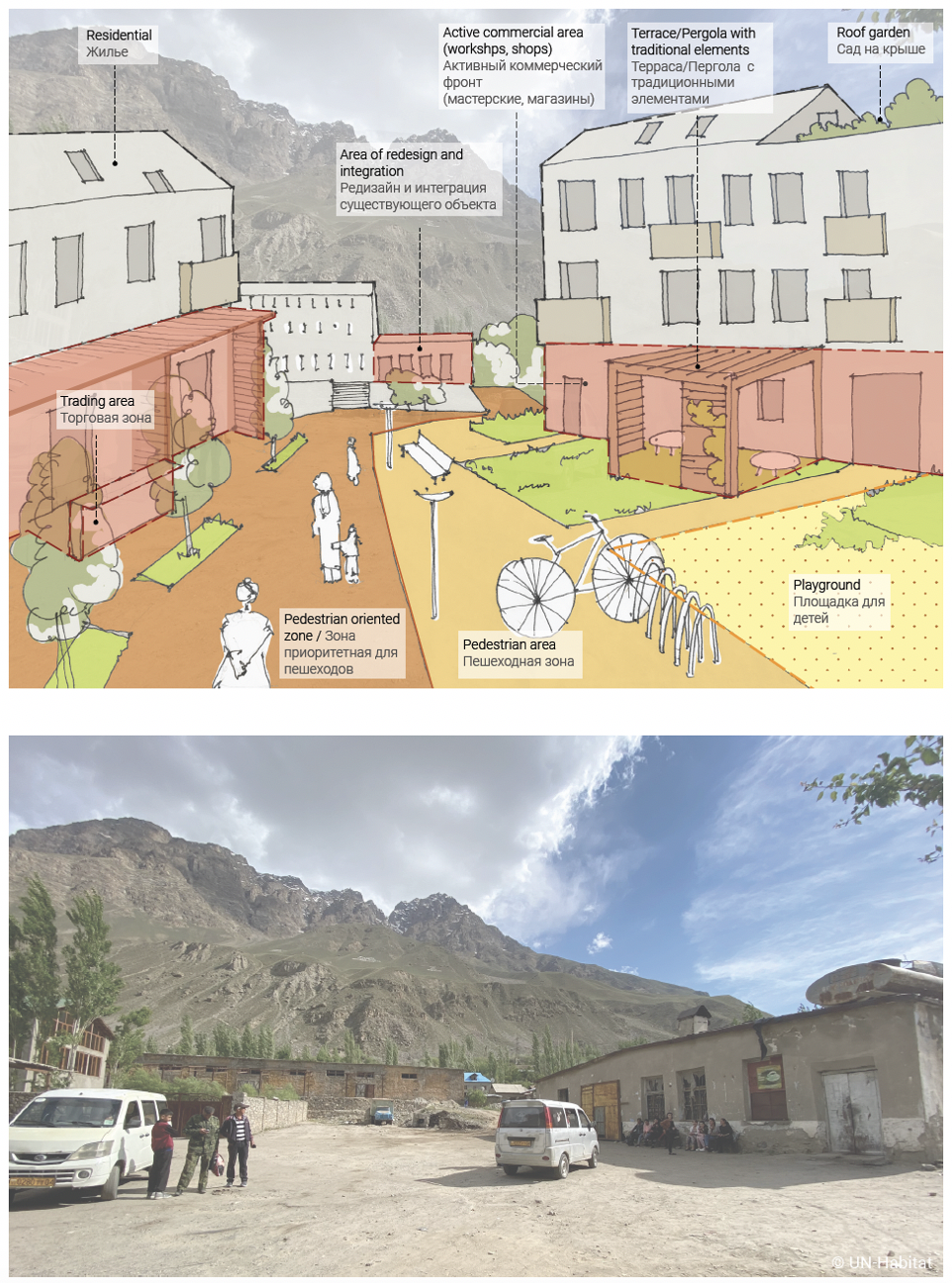 The concepts for design interventions entail the physical application of the UN-Habitat principles for sustainable neighbourhood planning in the context of Khorog, accounting for particular local features. The introduction of these principles to produce more sustainably planned neighbourhoods will significantly contribute to the achievement of the six strategic recommendations. The plots of under-utilised land have been initially selected in the strategic regeneration areas defined as a result of spatial analysis to create compact, integrated and connected neighbourhoods that would provide safe and affordable housing options for people, including those affected by hazards. Figure 7 shows a projected transformation in the area of the former bread factory into a mixed-use neighbourhood with pedestrian orientated infrastructure.